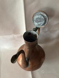 Dallah in rame di stile mediorientale, perfetto come pezzo decorativo o da collezione. Corpo bombato, beccuccio lungo ricurvo e coperchio con pinnacolo lavorato. Patina naturale che valorizza l’aspetto autentico e artigianale. Ideale per arredare cucina, soggiorno, taverna o locali in stile etnico/orientale. Oggetto solido, scenografico e ben conservato.