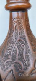 Realizzata in rame con una patina scura che suggerisce una certa età o un uso decorativo prolungato.