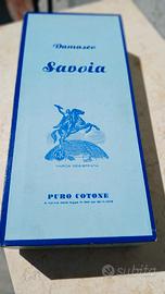 Rotolo intatto di damasco Savoia in puro cotone. Colore verde acqua. Tessitura italiana anni 80 di altissima qualità. Senza difetti, Ideale per biancheria da bagno di piccole strutture ricettive, cuscini, coperte, tende, rivestimenti, abbigliamento d'epoca. H 1 m, lunghezza 20 m. Vendo anche a metraggio di 10 euro