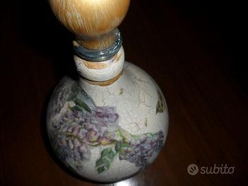 bellissima damigiana decorata a decoupage, completa di tappo, raffigurante un uccellino su un glicine, decoupage tecnica craclè, che da un aria antichizzata.