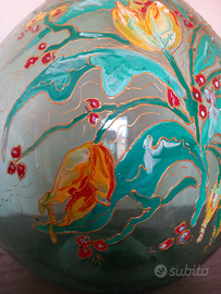Damigiana dipinta con colori acrilici e stucchetto materico dorato. TEME I GRAFFI quindi va pulita con un panno morbido e acqua. NO spugnette abrasive, NO solventi. Altezza 50 cm, diametro 35 cm. È un oggetto indicato x interni. Non spedisco. Solo consegna a mano