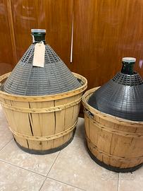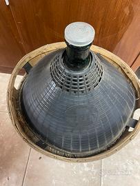 Vendo bellissima damigiana in vetro verde scuro, capacità 28L, completa di protezione in plastica nera e cesto in legno.