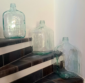 Damigiane boccioni in vetro bianco, a bocca stretta e chiusura a vite, squadrate.