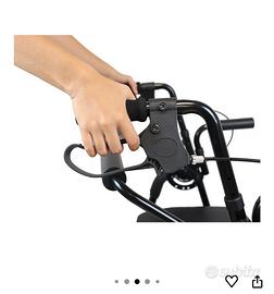 Principali punti in evidenza Marchio KMINA Colore Nero Materiale Alluminio Peso articolo 9,5 Chilogrammi Dimensioni del prodotto 82P x 56l x 95H cm Stile Moderno ed elegante IMPORTANTE 2 IN 1: Questo deambulatore con seduta permette all’utente di camminare in autonomia e, occasionalmente, di sedersi e farsi spingere come una sedia a rotelle su superfici lisce. Per un uso prolungato da seduti o su terreni irregolari si raccomanda l’uso di una sedia a rotelle tradizionale. RESISTENTE E VERSATILE: La struttura in alluminio e le quattro grandi ruote da 20 cm lo rendono stabile per uso interno ed esterno. Il sedile imbottito 36 x 33 x 5 cm e lo schienale offrono un appoggio confortevole, mentre la borsa in tessuto con chiusura a zip (portata massima 15 kg) permette di trasportare in sicurezza gli effetti personali. COMODO E REGOLABILE: Le impugnature sono regolabili in altezza da 82,5 a 95 cm, con 6 posizioni in passi di 2,5 cm, per adattarsi a utenti di diversa statura e favorire una postura più naturale durante la camminata. Questo deambulatore 2 in 1 è ideale per anziani o persone con mobilità ridotta. Peso massimo utente: 136 kg. SICURO CON FRENI A LEVA: Le leve del freno sotto le impugnature permettono di rallentare tirandole verso l’alto e di attivare il freno di stazionamento spingendole verso il basso fino al “clic”. I freni devono essere sempre bloccati prima di utilizzare la seduta e quando il deambulatore è fermo, come indicato nelle istruzioni. PIEGHEVOLE E COMPATTO: Il sistema di chiusura con aste di trazione consente di aprire e piegare il deambulatore in pochi gesti. Da chiuso misura 97 x 56 x 43 cm, con larghezza totale 55 cm e peso di circa 9,5 kg, così può essere riposto facilmente dietro una porta o nel bagagliaio dell’auto.