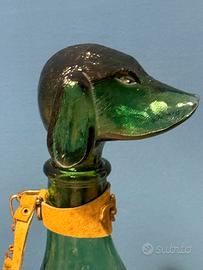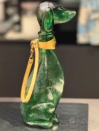 Decanter vintage in vetro Empoli italiano del 1970, raffigurante un bassotto di colore verde. Altezza circa 35.cm