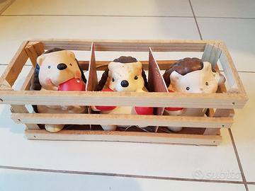 I tre simpatici animali del bosco che portano in mano dei funghi rossi sono sistemati in una piccola cassettina di legno, leggeri e facili da posizionare.
