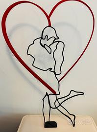 Elegante e stilizzato soprammobile che riproduce la sagoma di una coppia che si abbraccia scambiandosi un dolce bacio incorniciati da un cuore rosso