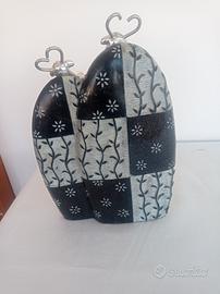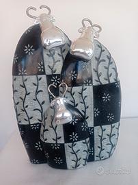 Splendido oggetto decorativo moderno raffigurante una famiglia di mucche stilizzato ed artistico . Design caratterizzato da un elegante contrasto tra il corpo decorato con motivi floreali a rilievo su sfondo a scacchi grigio e nero e le teste in finitura metallica lucida argentata . Ideale per ambienti moderni, rustico chic, o come pezzo da collezione particolare. Dimensioni : cm. 25 x 38 di altezza.
