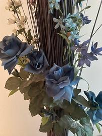 Decorazione verticale di circa 135 cm, in stecche e fiori finti, sui toni del blu