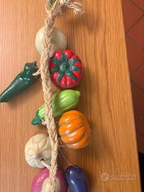 Decorazione da appendere al muro con corda e e frutta e verdura in terra cotta