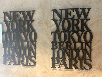 Vendo decorazione da parete in metallo, con i nomi di alcune delle principali città del mondo (New York, Tokyo, Berlino, Londra, Parigi).