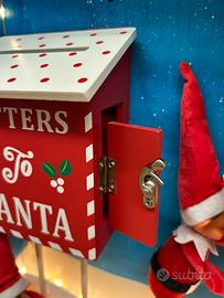 Villaggio degli elfi realizzato dentro cassetto di legno. Luce led con interruttore nascosto, cassetta per lettere a Babbo Natale funzionante e apribile. Misure 47 x 49 cm, profondita 10 cm.