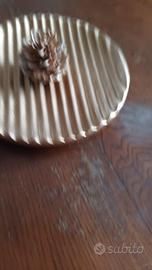 Decorazione dorata natalizia. Piattino da dessert ondulato dorato e pigna dorata