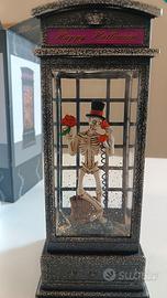 Decorazione per Halloween, con scheletro dentro cabina telefonica, in plastica ma ben rifinito,con led e brillantini, funzionante con 3 batterie stilo, 2 modalità: con luce e brillantini o con aggiunta di voce (risata e Happy Halloween) disponibile video nel caso