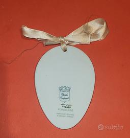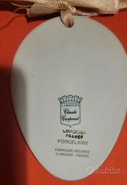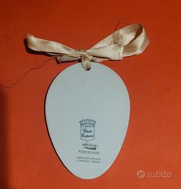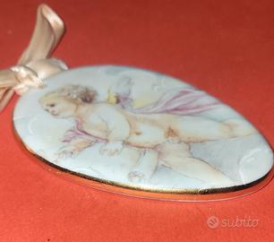 Elegante pendente vintage in vera porcellana Limoges, dipinto a mano e rifinito con bordo dorato. La scena raffigura un putto delicato su fondo celeste, tipico dello stile artistico francese più amato. Pezzo da collezione in condizioni eccellenti, senza crepe né sbeccature. Ideale come decorazione romantica o regalo speciale per chi ama l'arte e la tradizione europea. Le condizioni sono buone con qualche piccolo segno di usura.