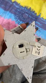 decorazione natalizia per albero di Natale luminosa dietro presenta il tasto di accensione on/off con linguetta inserita e pile incluse. La decorazione è a forma di stella e si illumina creando un'atmosfera