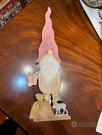 Indossa un alto cappello rosa con stellina decorativa, barba bianca soffice e tiene un regalino in mano. Alla base ci sono anche un sacchetto regalo e una piccola renna: davvero curato nei dettagli!