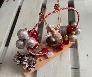 Legno, pigne, palline in plastica, sonagli in metallo, renna in resina e stoffa.