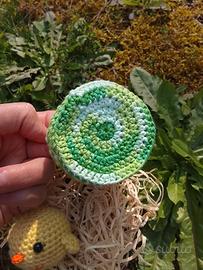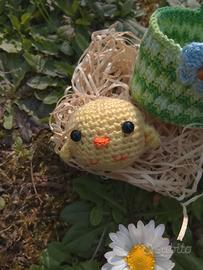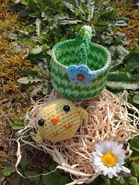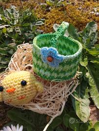 Set composto da un piccolo cestino porta ovetti realizzato ad uncinetto in cotone (resta rigido perché inamidato diametro 6cm, altezza 4cm) e un pulcino in amigurumi realizzato con acrilico (parziale imbottitura in riso), ideale come decorazione per la Pasqua. Non valuto offerte o sconti, il prezzo è fisso.
