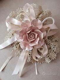 Vendo elegante decorazione profumata, composta da rosa decorativa, merletto e nastri, con tulle contenente sapone profumato sul retro. Ideale per centrotavola oppure come idea regalo raffinata. Ritiro a mano zona Prato P.zza S.Marco.