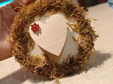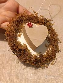 Delizioso addobbo a forma di cuore, perfetto per le festività natalizie o per San Valentino. Realizzato con una base in legno e decorato con muschio naturale. - Decorazione a forma di cuore. - Materiale: legno e muschio.