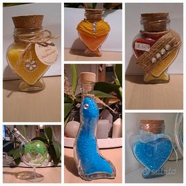 vasetti di vetro decorati a piacimento (sali colorati,bagnodoccia...)
