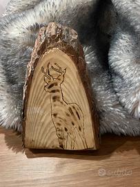 Varie decorazioni artigianali decorate a mano con pirografo, su diversi tipi di legno di recupero, abete, betulla ecc.