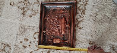 Bellissimo bassorilievo in rame con decorazioni floreali e motivi classici. - Realizzato in metallo con finitura color rame e oro. - Cornice decorata con motivo a corda.