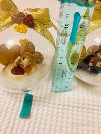 Sono due sfere di importanti dimensioni decorate con cura esternamente da filo e fiocchetti mentre internamente l'una contiene una statuina topolina natalizia con torta e l'altra statuina topolino con telefono.