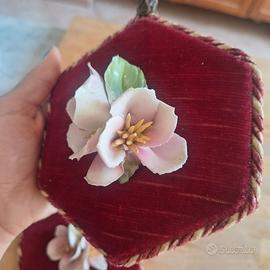 Al centro è applicata una decorazione floreale perfettamente intatta in porcellana, raffigurante dei fiori con petali rosa pallido e un bocciolo verde.