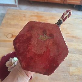 Il corpo principale è in velluto di colore bordeaux, con un bordo rifinito da una corda intrecciata nei toni del beige e del bordeaux.