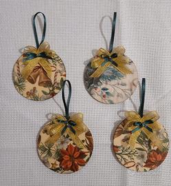 Addobbi per l'albero di Natale realizzati totalmente a mano con la tecnica del decoupage con carta di riso su dischi di legno di cm 7,5 di diametro.