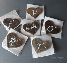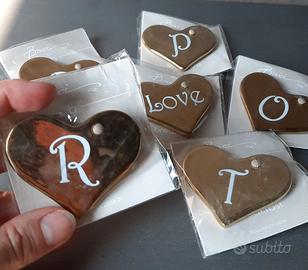 Cuore Messaggio della collezione 8½ Breakfast prodotta dal marchio Baci Milano Questi cuori (N. 8 PEZZI) sono accessori decorativi realizzati in materiale con finitura dorata e presentano diverse scritte o iniziali incise. Sono pensati come elementi intercambiabili per personalizzare altri prodotti della stessa linea, come mug, tazze, piatti o tazze jumbo.