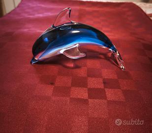 Splendido delfino in vetro artistico massiccio, realizzato a mano (area veneziana) nei primi anni 2000. L'oggetto è lavorato con la tecnica del "Vetro Sommerso": un cuore blu cobalto racchiuso in uno strato di vetro cristallino trasparente ad alto spessore.