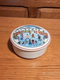 Scatola rotonda in ceramica di Villeroy & Boch. E' larga circa 16 cm e alta 6. Il coperchio è decorato come un raffinato quadro fiammingo: la scena descrive la cattura di un orso e gli abitanti del villaggio in osservazione. Disegno firmato Laplau.