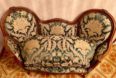 Elegante divanetto a 2 posti Luigi Filippo, prodotto da un mobilificio di CANTU', noto per l'alta qualità dei materiali usati, in legno finemente intagliato, tipico modello a barca con cornice curva e rivestimento in pregiata stoffa in seta verde/oro di altissima qualità. Tenuto in maniera maniacale in condizioni ottime.