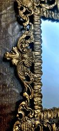 La cornice sapientemente lavorata e adornata con un Mascaron sormontato da una conchiglia, racchiude la superficie riflettente con un abbraccio di opulenza. Le delicate volute punteggiati da motivi floreali e vegetali, raccontano una storia di bellezza e cura artigianale, tipica dello stile Napoleone III, caratterizzato dalla fusione di elementi barocchi e rinascimentali, dall'opulenza e dalla ricchezza decorativa.