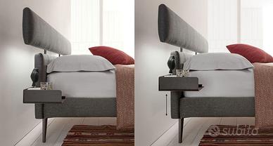 Un piano d’appoggio-tavolino è integrato alla testata e può essere posizionato a diverse altezze. Una pratica soluzione salvaspazio che sostituisce il comodino per avere tutto a portata di mano.