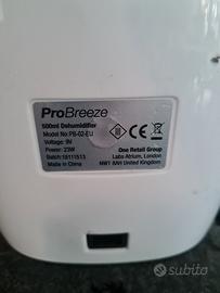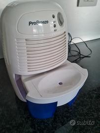 Vendo deumidificatore Pro Breeze Casa 500 ml, come nuovo, compatto, leggero e silenzioso, Perfetto per rimuovere umidità, muffa e acari della polvere che si trovano nell’aria dalla cucina, del bagno, della camera da letto, del garage, della cantina e della roulotte. Peso: 1kg Miaure: 18 X 28 X 16cm Auto spegnimento: Il deumidificatore si spegnerà in maniera automatica una volta che l’acqua raggiungerà la capacità massima della vaschetta. Inoltre, le spie serviranno anche come promemoria per lo svuotamento della vaschetta. Silenzioso ed efficiente: La tecnologia Thermo-Electric Peltier (nessun compressore è necessario) consente un funzionamento eco-friendly silenzioso, che lo rende il compagno ideale per l'utilizzo in camere da letto e uffici. A Basso Consumo Energetico: Utilizza una elevata tecnologia Peltier che garantisce non solo un risparmio a livello energetico ma anche assicura la silenziosità. Prezzo nuovo euro 49.99.