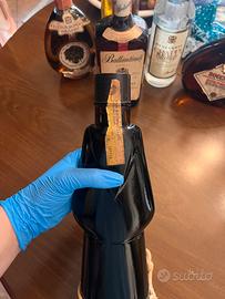Bottiglia vitage mai utilizzata tenuta in esposizione che presenta piccoli segni di usara dovuti alla vecchiaia.