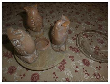 L'articolo è nuovo e si compone di una base che poggia su tre piedini con portalumini in pietra (asportabile) + tre gufi in pietra (asportabili) + robusto piattino portaessenze in vetro (asportabile).