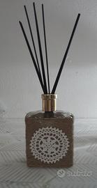 Diffusore in vetro trasparente, rivestito in juta naturale e decorato con centrino antico salentino lavorato a mano.