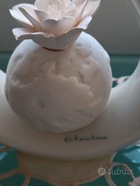 È in porcellana con il fiore centrale in gesso con lo stoppino interno per diffondere l'aroma nell'ambiente .