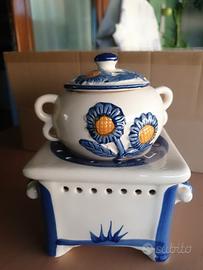 realizzato in ceramica presenta decorazioni dipinte a mano in questo caso con motivi floreali blu e gialli tipici dell'artigianato