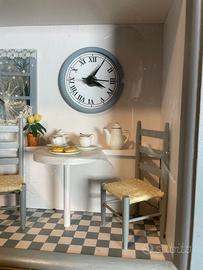 Bellissimo diorama vintage in legno,rappresentante una cucina tipica con orologi a parete funzionante,in teca di legno con vetro estraibile.