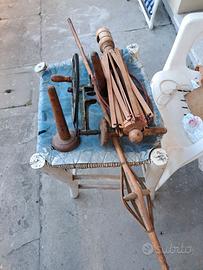 introvabile, in tutte le sue parti, girella a cinghia con rocchetto da tavolo , dipanatore ad ombrello porta matassa sempre da tavolo, fuso da filatoio ,tutto originale, nei mercatini difficile trovare il set completo