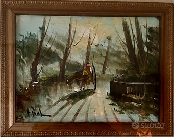 Dipinto a olio incorniciato raffigurante un paesaggio fluviale o palustre con un personaggio su un carro trainato da un cavallo.