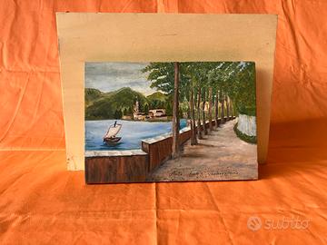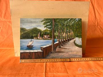 Dipinto a olio su legno raffigurante il paesaggio lacustre del Lago d'Orta con una fila di alberi e una barca a vela. Dimensioni 20 cm x 27 cm.