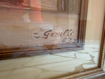 Splendido dipinto a olio su tela del 1983, che ritrae una suggestiva veduta prospettica di una piazza storica italiana. L'opera è caratterizzata da calde tonalità terrose e una luce morbida che valorizza l'architettura dei portici e del campanile sullo sfondo. • Artista: Firmato in basso a destra "Garulli". • Anno: 1983. • Tecnica: Olio su tela. • Soggetto: Paesaggio urbano/architettonico (scorcio di borgo con portici e torre campanaria). • Cornice: Inclusa, in legno con finitura dorata e passe-partout beige, di ottima fattura. • Stato di conservazione: Eccellente. La tela è ben tesa sul telaio originale e non presenta segni di cedimento o crepe nel colore. Dimensioni: (Ti consiglio di misurare la tela e la cornice e inserirle qui, ad esempio: Tela 40x50 cm / Con cornice 60x70 cm). Prezzo trattabile