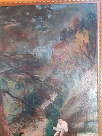 Dipinto di paesaggio a olio, con scena di persone vicino ad un fiume. Scorcio di bosco. Dimensione prodotto: cm 82×70, cornice inclusa.